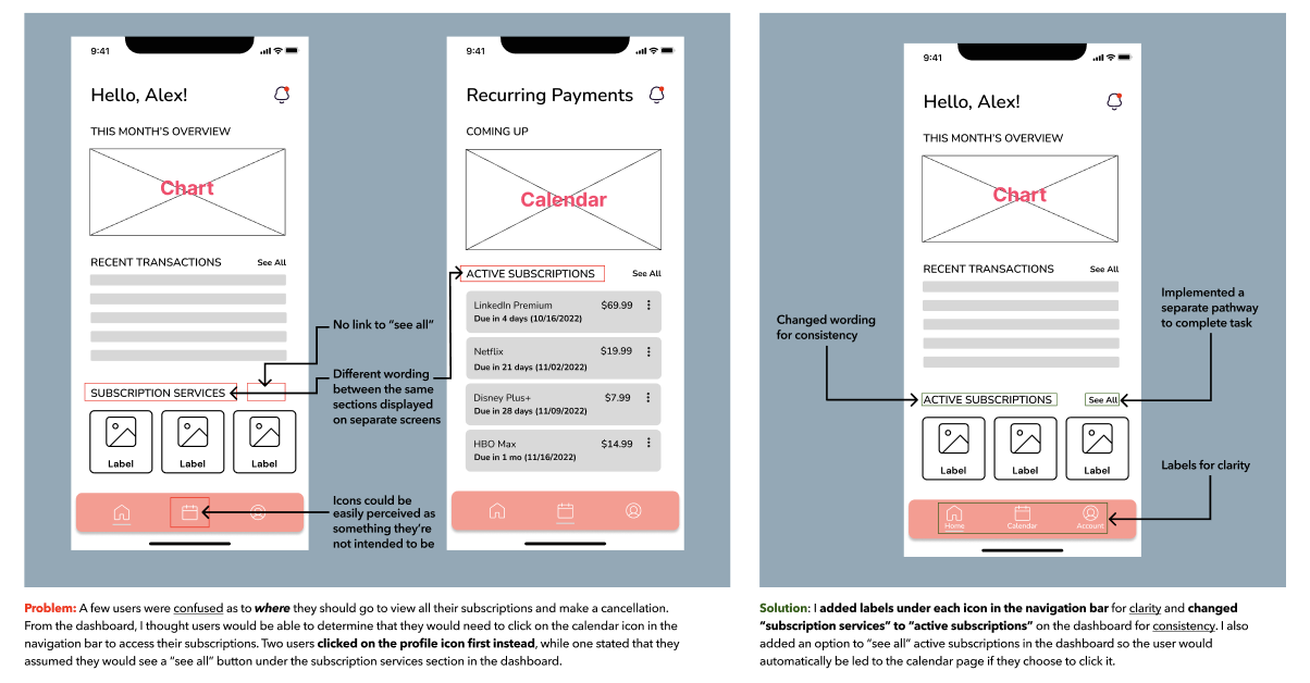 Before moving on to creating my high-fidelity mockups, I interviewed five participants and had them test my wireframes to see if they were capable of both cancelling a subscription and adding a new subscription as a “returning” user. Below are some of my major findings: