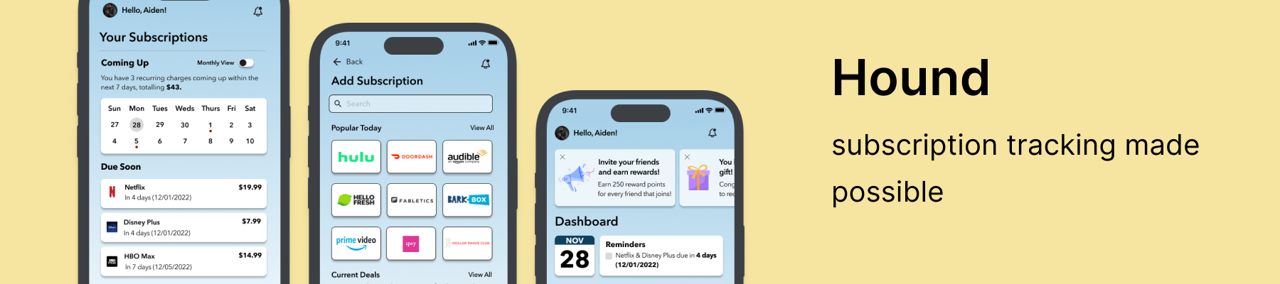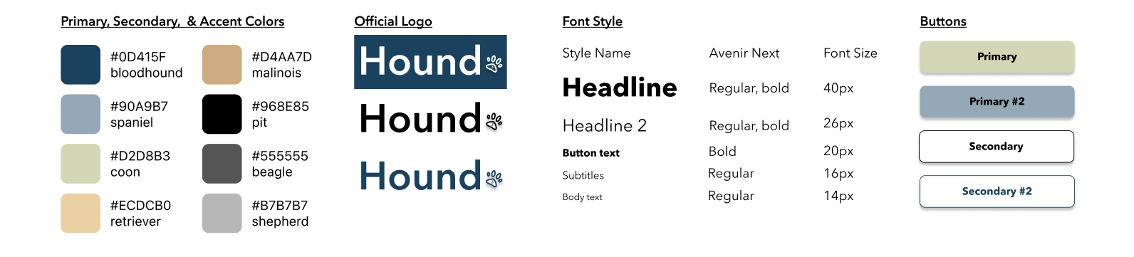 After setting up my research plan, I began creating a style guide. I focused on colors that promoted a sense of trustworthiness and care, as well as a friendly and calm feel. The name “Hound” was inspired by the breed of canines with the highest sense of smell that allows them to accurately “track down” things. Current and target users include middle-classed, tech savvy men and women over the age of 30 so I wanted to keep the overall design sleek and simple that would appeal to this specific demographic.