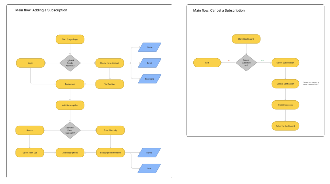 After wrapping up my competitive research analysis, I began creating user flows based on the company’s business goals of a user being able to freely manage their subscription services, including cancelling an unwanted subscription and adding a new one. Doing so allowed me to determine how many screens were necessary to provide the user with the best chances of success when completing these tasks and at what order they should be placed in.