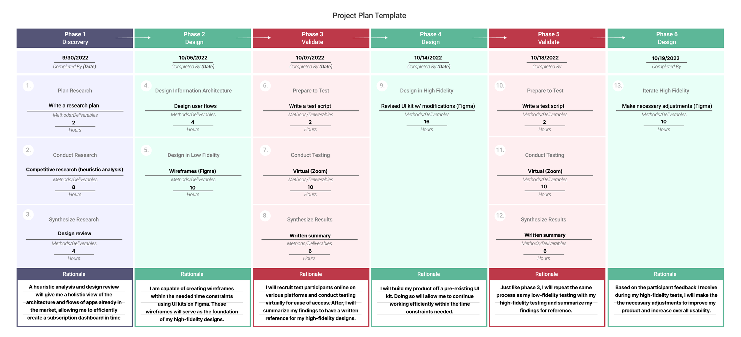 At the start of this project, I created a research plan with the goal of having a final product ready in 90 hours over the course of 19-20 days. In the plan shown below, I identified the research methods I believed would best allow me to understand how to approach designing this mobile subscription tracking app. I then set the timeframe I would use to efficiently create my information architecture, wireframes, hi-fidelity mockups, usability tests, and iterations.