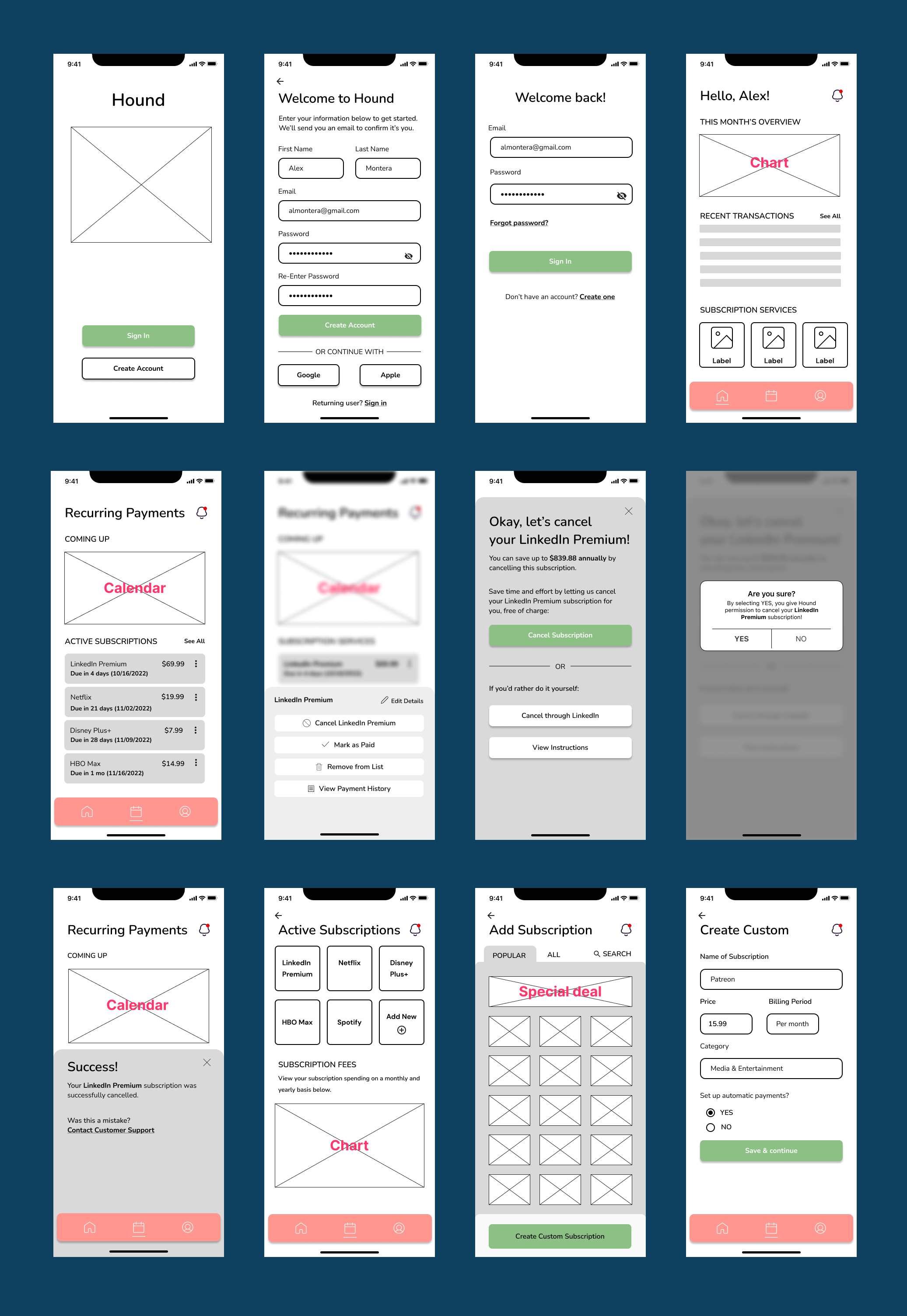 I came in to revamp this company’s vision and take what would be normally displayed on a desktop screen into a smaller, handheld mobile device to reach a broader audience. Although I had full creative control, it was challenging to keep to a designated timeline. Furthermore, when laying out the main flows that align with the business goals, it was also quite challenging to place focus on what was already given to me, rather than trying to make this application “bigger” and “greater”. For example, it was tempting to try and make this subscription tracker app into a one-stop finance app like Mint, but as I continued to test my designs and reiterate based on user feedback, I remembered that it is critical to make improvements within the right context as future goals can always be established and worked on later.