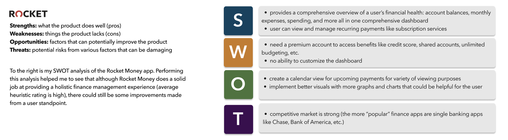 In addition to my heuristic analysis, I also conducted a modified SWOT analysis to further understand the elements that could either positively or negatively affect the user experience of each app. This process provided me with some ideas of the features I could implement into my own product that would thus give it more competitive edge.