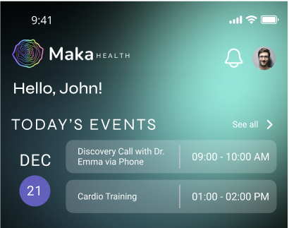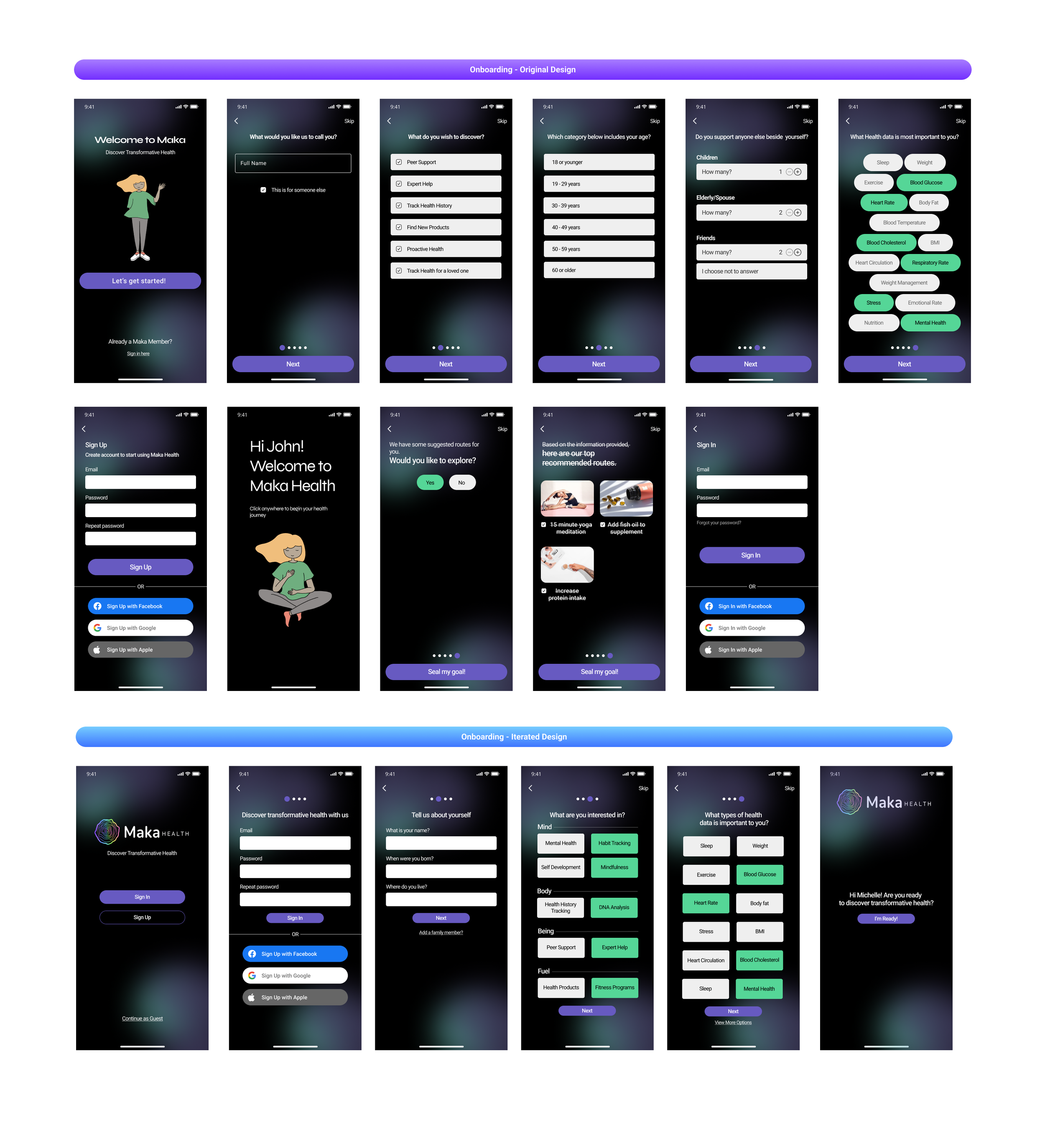 The branding, previous user research, and existing onboarding and dashboard flows of the Maka Health demo app were provided to us prior to the start of this project. To make the most use of our time, the design team and I decided to place focus on auditing and iterating Maka Health’s current design system in relation to their onboarding and dashboard screens.
