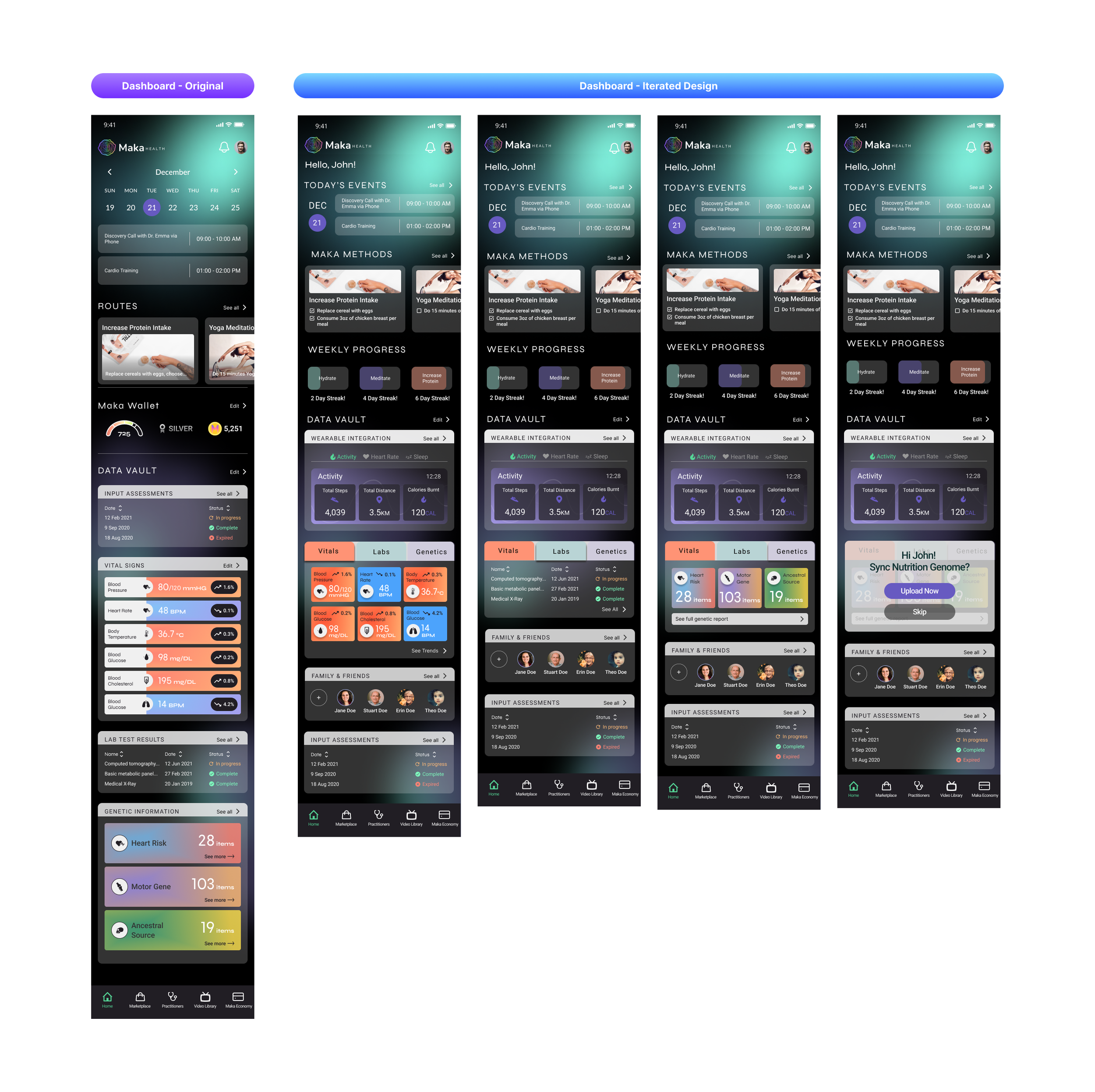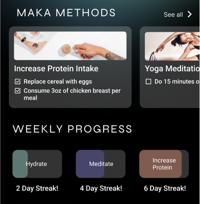 We began this project by analyzing the user research Maka Health’s design team conducted previously. Based on the research, we recognized that Maka Health’s current target demographic were older women (aged 35-55), also known as “digital health optimizers”, that had an interest in supporting their wellbeing by participating in holistic health practices such as supplement intake, yoga and meditation, etc. Maka also began implementing a feature that allows users to upload their nutritional genome data, similar to platforms like Ancestry or 23andMe, making the platform an all-encompassing health vault for the user.
