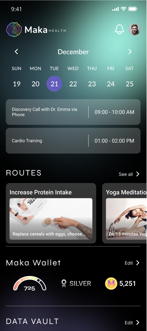 Maka Health, a functional wellness company, is looking to revamp their demo app before launch. Their app is designed to allow users to upload their personal health data and have a community of practitioners, science-backed supplement recommendations, and unique holistic health programs recommended to them via their AI system. In this project, I – along with two other UX/UI designers – were tasked with redesigning the onboarding process and the home dashboard to improve overall visual hierarchy and improve user engagement with the app’s health tracking features.